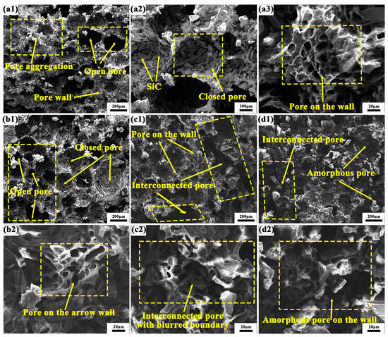 Microstructure of PVA/PF/PTA/SiC composite grinding wheel: (a1–a3) PF/PVA-1799; (b1,b2) PF/PVA-2699; (c1,c2) PF/PVA-1799 + PTA; (d1,d2) PF/PVA-2699 + PTA.