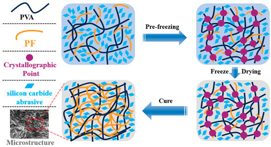 This study utilizes the freeze-drying technology to fabricate PVA/PF/PTA/silicon carbide (SiC) composites. Phenolic resin and pure terephthalic acid (PTA) were introduced to provide additional crosslinking sites for polyvinyl alcohol (PVA), thereby enhancing the mechanical strength of the polymer matrix by modulating the degree of polymerization of PVA and the concentration of PTA. The formation and sublimation of ice crystals during the freezing process were meticulously controlled to optimize the uniformity of the pore structure. A homogeneous mixture of PVA/PF/PTA/SiC was pre-frozen to form a network-crosslinked structure, leading to the successful development of a unique porous architecture that significantly improves the strength and consistency of the grinding wheels. This work offers an innovative and environmentally friendly method for manufacturing PVA grinding wheels. The incorporation of PF and reactive substances containing carboxylic acid groups, instead of toxic chemicals such as formaldehyde and hydrochloric acid, significantly enhances the mechanical strength of PVA. Additionally, the freeze-drying technology allows for precise control over the pore structure of PVA, resulting in favorable grinding performance in advanced manufacturing.