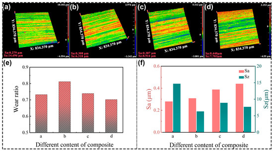 Four grinding wheels were prepared successively based on the materials in Table 1, and the grinding results are shown in Figure 10. The lowest surface roughness parameter of Sa is 0.279 μm, which is observed in Figure 10a. The color scales predominantly feature green hues, with a notably uniform distribution, while the parameter of Sz is the highest at 14.696 μm. The grinding wheel made of PF/PVA-1799 without PTA is relatively soft to achieve a smooth surface, but disabled to perform the mass removal of the TA1 material. Figure 10b demonstrates the results processed by the grinding wheel with PTA. The Sa increased to 0.308 μm, but the Sz decreased to 6.318 μm. The scratches in Figure 10b are more pronounced compared to those in Figure 10a. Meanwhile, Figure 10e shows that the grinding wheel “b” containing the PTA with relatively hard properties exhibited the highest wear ratio of 0.81 in the grinding test. The intermolecular crosslinking attributed to the enhancement of the resin matrix and uniform distribution of pores (Figure 8(b1,b2)) are advantageous for enhancing the grinding performance of porous composite materials, ensuring an optimal distribution of SiC abrasives on the pore walls to maximize the involvement of abrasive particles in the grinding process per unit contact area.