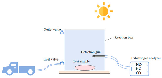 (1) Check the airtightness of the reaction vessel to ensure that the reaction chamber is sufficiently sealed. Add 8 g of photocatalytic material to anhydrous ethanol, and put it into four petri dishes with a diameter of 180 mm on average. After ultrasonication for 10 min, put it in an oven at 80 °C for drying. Put the above-mentioned culture dish with the catalyst in the gas reaction chamber. If the test sample is a specimen, put it directly on the bottom plate, seal the reaction chamber, and seal it again with foam sealant. Initiate the procedure by opening both the inlet and outlet control valves. Subsequently, establish a connection between the air duct and the vehicle’s exhaust system. Finally, commence the automobile’s pre-heating phase, allowing it to run for a duration of 3 to 5 min.