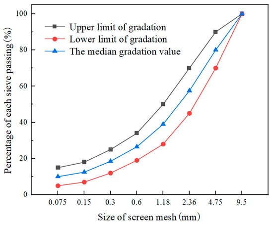 This study adopted the midpoint value within the gradation range specified for MS-3-type mineral aggregates in the respective standard as the basis for determining the gradation composition in designing the mixture proportions. Depicted in Figure 3 are the upper and lower boundaries defining the aggregate gradation, along with the composite gradation curve.