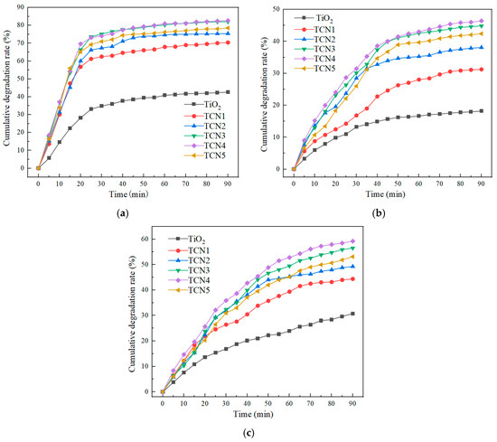 The cumulative degradation rates of three gases by the TiO2/g-C3N4 composite photocatalyst and anatase TiO2 prepared under different mass ratios under natural light are shown in Figure 4a–c.