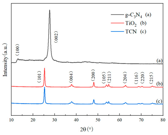 From Figure 6 showing the XRD charts of pure TiO2, pure g-C3N4, and TCN, it can be seen that TiO2 was a typical anatase phase, and there were sharp diffraction maximums at 2θ = 25.36°, 37.82°, 48.20°, 53.87°, 54.91°, 62.70°, 68.84°, 70.31°, and 75.15°, which corresponded to (101), (004), (200), (105), (211), (204), (116), (220), and (215) lattice planes of anatase TiO2, severally. There were no characteristic peaks of other crystal forms, indicating that it had good crystallinity. The characteristic peaks of g-C3N4 appeared at 13.11° and 27.39°. The characteristic peak of 13.11° was formed by the accumulation of an in-plane tri-s-triazine ring motif structure, which corresponded to the (100) crystal plane of g-C3N4. The characteristic peak of 27.39° was present because of the accumulation of aromatic compounds in the ringed adjoint system between the characteristic layers of g-C3N4, relating to the (002) crystal plane of g-C3N4. From the XRD diffraction pattern of the TCN samples, it can be found that the diffraction peak position was basically unchanged compared with pure TiO2, indicating that the addition of g-C3N4 had little effect on the crystal structure of TiO2. The characteristic peaks of 13.11° and 27.39° of g-C3N4 did not appear in the composites. There are two factors: one is that nano-TiO2 was attached to the surface of g-C3N4, so that the diffraction peak of g-C3N4 was weakened and it was difficult to be detected. The other is that the crystal structure of nano-TiO2 was less affected during the high-temperature calcination process, resulting in the characteristic peak intensity of g-C3N4 being obscured by the characteristic peak intensity of TiO2.