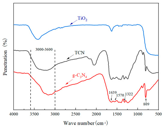 FTIR spectra of TiO2, g-C3N4, and TCN.