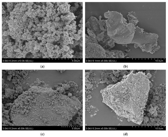 Figure 8a shows the SEM picture of TiO2. It can be drawn that TiO2 particles are approximately spherically stacked together, and the agglomeration phenomenon is more serious. This is attributed to the small diameter of TiO2 nanoparticles, the surface energy being large, and it being easy to agglomerate, which affects the photocatalytic activity of TiO2. From the SEM image of g-C3N4 in Figure 8b, it can be seen that the material was lamellar and the surface was relatively smooth and flat, indicating that melamine had generated graphite-like lamellar g-C3N4 by high-temperature thermal polymerization. Figure 8c,d shows the SEM picture of TCN composite photocatalytic materials under the optimal preparation process. It can be seen that TiO2 particles were uniformly distributed on the surface of the g-C3N4 sheet structure, and the small particles show a highly dispersed state. There was no agglomeration phenomenon, and g-C3N4 was not completely covered, indicating that the presence of g-C3N4 inhibited the agglomeration of TiO2. Therefore, the composite photocatalytic material TCN had a big surface area, thereby increasing the photocatalytic activity of TiO2, the contact area with the polluted gas increased, and the degradation rate increased.
