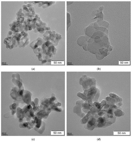 The TEM images depicted in Figure 8 illustrate pure TiO2, pure g-C3N4, and TCN. It can be observed from Figure 9a that the TiO2 structure was stacked by a large number of small particles, and each particle was closely connected and the agglomeration phenomenon was more serious. From the transmission electron microscope image of g-C3N4, it can be seen that it presented a thin yarn sheet structure with a lighter color. From Figure 9c,d, it can be fairly seen that the distribution of nano-TiO2 particles on the layered structure of g-C3N4 sheet, which was evenly dispersed, reduced the agglomeration phenomenon and formed a closely connected composite with g-C3N4 sheet. The TEM image of the TCN composite photocatalytic material was consistent with the scanning electron microscope test image, which proves that the two materials were successfully compounded. From Figure 9c,d, it can also be seen that the g-C3N4 in TCN was not completely covered by TiO2. At the same time, due to the attachment of TiO2 particles, the surface of TCN formed voids of different sizes and shapes, which increased the surface area of the bonded material. It not only did not affect its absorbance, but also increased the contact area with automobile exhaust, and could capture photogenerated electrons, increase carrier separation rate, and improve photocatalytic activity.