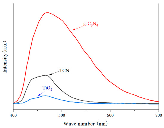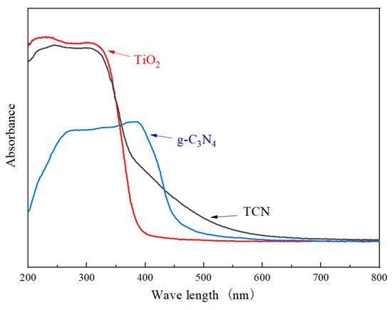 (2) The particle size of TiO2 nanoparticles was very small, the surface energy was large, and it was easy to agglomerate. The g-C3N4 was lamellar, and the surface was relatively smooth. The TiO2 particles in the TCN composite were evenly distributed on the surface of the g-C3N4 sheet structure, and the small particles showed a highly dispersed state, indicating that g-C3N4 inhibited the agglomeration of TiO2. The crystal structure of TiO2 and g-C3N4 was not damaged during the synthesis process. The g-C3N4 inhibited the agglomeration of TiO2. The introduced N-Ti bond changed the electronic structure of TiO2, narrowed the band gap and broadened the visible light response range.