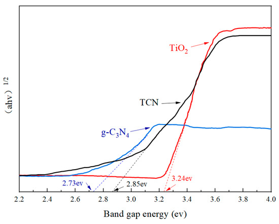 Figure 10 illustrates that the pure TiO2 ceased to exhibit light absorption at a wavelength of approximately 383 nm, a value that aligns with the inherent absorption edge of anatase-phase TiO2. In the ultraviolet light range of 200 mm~380 nm, the absorbance of TiO2 was greater than that of TCN and g-C3N4, which is related to the characteristics of TiO2 itself. Within the visible light spectrum spanning 400 nm to 600 nm, the observed absorbance was diminished compared to both TCN and unadulterated g-C3N4. The light reaction range of the TCN composite material was 200 nm~600 nm, which is superimposed with the light response range of g-C3N4 and TiO2. Compared with g-C3N4 and TiO2, there is a significant red shift, which allows it to have excellent light response intensity. It can be seen from Figure 11 that the band gaps of TiO2, g-C3N4, and TCN were 3.24 eV, 2.73 eV, and 2.85 eV, respectively. The energy gap of the composite photocatalytic material TCN was between TiO2 and g-C3N4, and its value was 0.39 eV lower than that of pure TiO2. The incorporation of g-C3N4 suggests the formation of N-Ti bonds, leading to modifications in TiO2’s electronic structure. This alteration reduced the band gap energy, thereby enhancing the visible light absorbance capability of the composite material, TCN. Consequently, the photocatalytic redox potential of the material was significantly augmented.