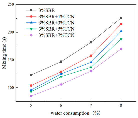 The asphalt–stone ratio was initially set as 7%, and the cement content was 1.5%. The mixing experiment was carried out on the micro-surfacing with different water consumptions of 5%, 6%, 7%, and 8%. The mixing time experiment results of the micro-surfacing mixture with different TCN material contents are shown in Figure 13.