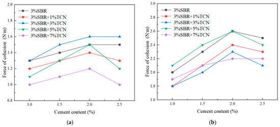 Cohesion test results of mixtures with different TCN material contents: (a) 30 min cohesion; (b) 60 min cohesion.