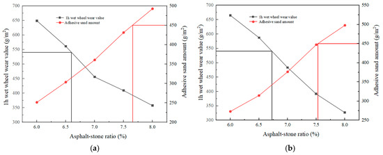 The water consumption of the SBR-modified emulsified bitumen micro-surfacing mixture was 6%, the water consumption of the micro-surfacing mixture with photocatalytic material was 7%, the cement dosage was 2%, and the different oil–stone ratios (6%, 6.5%, 7%, 7.5%, 8%) were changed. The 1 h wet wheel wear test and the load wheel sticky sand test were carried out, respectively. According to the specification, the test data were drawn into a diagram, and the most excellent oil–stone ratio range was obtained. The drawing is shown in Figure 15.