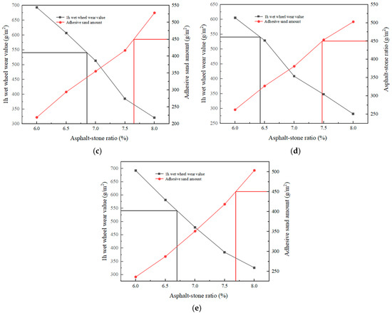 Oil–stone ratio curve of mixture with different TCN material contents: (a) 3%SBR-modified emulsified asphalt; (b) 3%SBR + 1%TCN-modified emulsified asphalt; (c) 3%SBR + 3%TCN-modified emulsified asphalt; (d) 3%SBR + 5%TCN-modified emulsified asphalt; (e) 3%SBR + 7%TCN-modified emulsified asphalt.