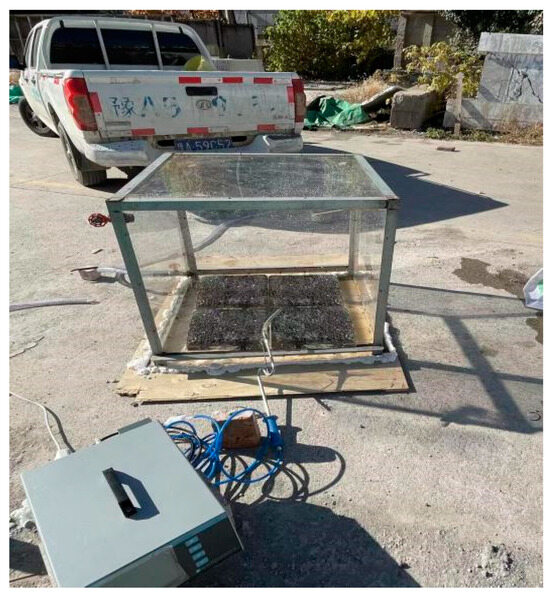 With the purpose of evaluating and analyzing the degradation effect of photocatalytic materials on NO, CO, and HC in motor vehicle exhaust gas, a set of photocatalytic degradation devices was designed and assembled by our research group, including a gas reaction chamber, gas source channel, and real-time monitoring gas concentration equipment. The schematic diagram is shown in Figure 2. The experiments were conducted outdoors under natural sunlight between 10:30 and 15:00 Beijing time. In order to be closer to the composition of automobile exhaust, the gas source device selected 92# gasoline as the fuel of the Great Wall pickup truck. The lower side of the gas reaction chamber was an open square body with a size of l × b × h = 800 mm × 800 mm × 800 mm. The four sides and the top surface were made of organic glass. The thickness of the glass was 10 mm. It could observe to transmit over 92% of incident sunlight and 73.5% of ultraviolet radiation. The side was equipped with an intake valve, an exhaust valve, and a small hole. The bottom plate was a wooden board, and the size was larger than the bottom area of the reaction chamber. The polyurethane foam sealant was used to seal the test. The real-time gas concentration detection device selected the MKA-502 automobile exhaust gas tester of Foshan Hanchuang Detection Instrument Co., Ltd.