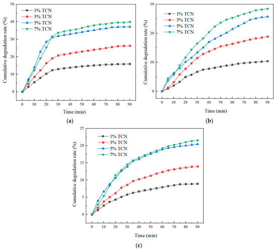 The cumulative degradation rate of automobile exhaust with different TCN contents. (a) Cumulative degradation rate of NO. (b) Cumulative degradation rate of CO. (c) Cumulative degradation rate of HC.