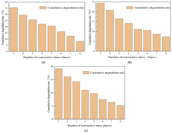 When the TCN composite photocatalytic material decomposes nitrogen oxides, inorganic substances such as nitrates will be generated. When these substances cover the road surface, they will affect the light absorption degree and have a negative impact on the photocatalytic performance. Still, following the test method in Section 2.2, the photocatalytic degradation test of automobile exhaust on the test specimens was carried out. The number of continuous tests was designed to be eight times, and the test duration was 90 min. The evaluation was made through the cumulative degradation efficiency index. The test results are shown in Figure 18.