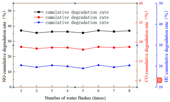 The cumulative degradation rate of NO, CO, and HC by water washing times.