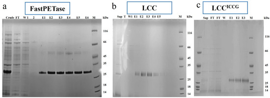 FastPETase, LCC, and LCCICCG were expressed in the Escherichia coli strain BL21 (DE3). FastPETase was obtained from the cytoplasmic fraction (Figure 1a) after the cell lysis whereas LCC and LCCICCG were obtained in extracellular supernatant (Figure 1b,c and Figure S1). LCC and LCCICCG contain N-terminal pelB leader peptide that guides protein into the periplasmic space. The pelB peptide does not correspond to the active transport of the enzymes to extracellular space. However, the enzymes were recovered from the culture supernatant. It could be attributed to the phospholipase activity of these enzymes especially cutinases [27,28,29] which makes the cell membrane permeable and the cause leaking of the enzyme out of the cell. There was no cell cytotoxicity observed during the growth phase and enzyme production. After expression and purification, a final yield of 26, 35, and 32 mg L−1 of culture was obtained with a specific activity of 968 ± 15, 1430 ± 27, and 2187 ± 19 U mg−1 for FastPETase, LCC, and LCCICCG, respectively (Table S1).