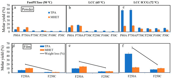 After the preliminary tests, P80A and F250A were used in subsequent experiments. Enzyme loading for efficient conversion is an important parameter of enzymatic processes such as PET hydrolysis. PET weight loss and monomer release reached a maximum (24.4% weight loss, molar yield of 10.3, and 15% of TPA and MHET) when 0.5 mg g−1 PET FastPETase was used at 50 °C in potassium phosphate-NaOH buffer (pH 8.0) after 96 h (Figure 3a). Interestingly, the PET hydrolysis did not improve when the concentration of FastPETase was increased to 1 and 2 mg g−1 PET. A recent study showed the low thermostability of FastPETase during PET hydrolysis at different reactor scales compared to other variants [2]. LCC on the other hand showed increased depolymerization of both powder and film (Figure 3b) with an increase in enzyme loading, reaching a maximum weight loss of 32% at a concentration of 1 mg g−1 PET. The performance of ICCG at 1 mg g−1 PET enzyme loading was superior where the depolymerization was approximately 58% and TPA and MHET molar yield of 55% and 7%, respectively. LCCICCG has been reported to convert 200 g L−1 amorphized PET to 90% over 10 h at 3 mg g−1 PET enzyme loading [19]. Similar results were obtained by Brizendine et al. [33] when depolymerization was performed at 65 °C and 100 g L−1 loading of PET film (1 × 1 cm) but in 48 h. The amount of TPA compared to MHET also kept increasing (Figure 3c) with increased enzyme loading. A possible explanation could be that the enzyme performs endo cleavage first on the polymer, so at lower enzyme concentrations, more oligomers are released than monomers or MHET is primarily released but then hydrolyzed further.