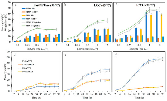 The temperature of incubation was also optimized for these enzymes (Figure S3a–c). All these enzymes exhibited maximum depolymerization at their respective reported optimum temperature, i.e., 50 °C, 65 °C, and 72 °C for FastPETase, LCC, and LCCICCG, respectively [17,18,19] (Figure S3). As expected, the thermostability analysis suggested that FastPETase is least stable in all tested temperatures (50, 60, and 72 °C) after 36 h followed by LCC and LCCICCG (Figure S4). Furthermore, PET hydrolysis efficiency was monitored over time. It can be seen from Figure 3d that FastPETase achieved maximum depolymerization and molar yield (13.75% MHET and 8% TPA) in 33 h. The depolymerization process slowed down after 36 h and no significant changes were observed after longer incubation times (Figure 2c). This can be due to poor thermostability and short half-life of FastPETase, changes in pH or a combination thereof [2]. LCC showed an improved depolymerization performance (Figure 3e). The released monomer (for both powder and film) increased with prolonged incubation time and molar yield of 26% and 24% of TPA and 14.5% and 13% of MHET (P80A and F250A) in 60 h. LCCICCG also exhibited maximum depolymerization after 60 h (Figure 3f) but with a higher molar yield of TPA (54%) and less MHET (7%). The TPA yield marginally increased to 56.5% after 72 h and remained constant after that. Brizendine et al. [33] observed differences between the large-scale (bioreactor conditions) and small-scale reactions for MHET concentrations where large-scale reactions generally built up less MHET than small-scale ones. LCCICCG will preferentially release TPA due to the inhibitory effect of MHET. The reactions can be complemented by adding a carboxylesterase or MHETase to further improve the depolymerization efficiency [37,38].