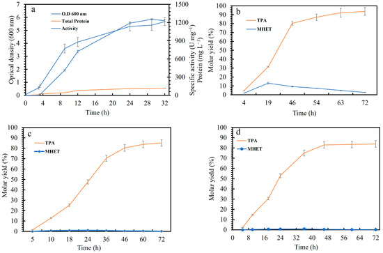 In the PET hydrolytic process, pH is a crucial factor with a huge impact on the overall depolymerization. It significantly affects enzyme stability, activity, substrate binding, and product solubility. Consequently, the efficiency of PET hydrolases depends on the optimal pH conditions that support catalytic activity and structural integrity. We performed depolymerization of different PET substrates (PET film, Powder) in the 1 L reactor in the optimized conditions, i.e., 13 g L−1 substrate loading (PET film or powder). The E. coli BL21 cells containing LCCICCG were grown in an M9 medium (0.1% ammonium chloride and 0.5% glycerol, 20% pO2, pH 7.2). After induction with IPTG, the cells were grown for 32 h (Figure 5a). The final OD600 of 5.7, total protein content in the supernatant of 119 mg L−1, and pNPB activity of 1232 U mg−1 were reached in the bioreactor. Similarly, a fed-batch fermentation (1 L) using LB medium or autoinduction medium with glucose feeding and IPTG induction led to the production of 12 g L−1 total protein (10–15% of the target protein LCC) [39] which is higher than the current study. However, it is to be noted that in the current study, the production of the enzyme was performed in a minimal medium and 0.2% glycerol in a batch reactor. 30% of the total protein produced extracellularly accounts for LCCICCG. The enzyme cost during the PET hydrolysis is a key cost driver and a balanced production process with lower costs and higher enzyme yields will be an advantage [22]. After removing cell debris, one-half of the supernatant (1 L) was used for purification and the other half for the bioprocess using the crude enzyme. With the purified enzyme-catalyzed reaction with film F250A, MHET concentration reached a maximum molar yield of 13.1% after 19 h and decreased after that, whereas TPA formation reached the maximum of 94% molar yield in 72 h (Figure 5b) and was also verified by quantitative NMR (Figure S5). However, almost 90% of TPA was released in 25 h showing the efficiency of this enzyme. The molar yield of TPA (Figure 5c and Figure S6) and powder using the crude supernatant reached 90% in approximately 46 h. However, MHET release was very low compared to TPA. NMR spectrum revealed the presence of isophthalic acid and some unknown aromatic compounds (Figures S5 and S6). Another interesting difference is the lag phase during the initial hours (5–7 h) for PET film (using a purified enzyme and crude supernatant) which was not evident for powder. Brizendine et al. [33] also observed a lag phase 1 × 1 cm film which seemed to be dependent on the surface area and enzyme concentration. It can be explained by the fact that the enzyme performs an endo cleavage on PET which would not release monomers during the initial phase [31,33]. They also reported that PET particle size does not have an appreciable effect on total depolymerization [33,40,41].