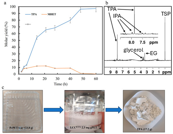 (a) Depolymerization profile (mol% of TPA and MHET relative to PET) of pcPET tray (1 × 1 cm) using the LCCICCG. The reaction was performed in a 1 L volume containing 50 mM KH2PO4-NaOH buffer (pH 8.0), 2.3 mg g−1 PET of crude LCCICCG, 23.8 g L−1 PET tray at 62 °C with pH control (1 M NaOH). The monomers released were measured using HPLC. (b) NMR spectrum of TPA recovered after 60 h. Apart from TPA, the sample contains IPA, which is part of commercial PET, EG from the hydrolysis of PET, glycerol from the culture medium, and TSP-d4 as a chemical shift standard. (c) Post-consumer PET tray was used for the enzymatic reaction and TPA recovered after the hydrolysis.