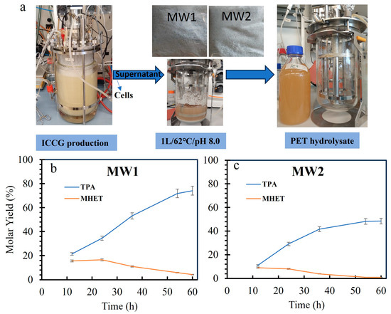 (a) Schematic representation of LCCICCG production using recombinant E. coli BL21 cells in the 2 L reactor. The supernatant was concentrated 2 times using ultrafiltration (10 kDa). The mixed plastic wastes MW1 and MW2 were added to the supernatant in separate reactions (100 g L−1 PET). The reaction was performed in 1 L volume containing approximately 2.5 mg g−1 PET of crude LCCICCG at 62 °C with pH control (1 M NaOH). HPLC measurements of TPA and MHET during depolymerization of mixed PET waste (b) MW1, and (c) MW2.