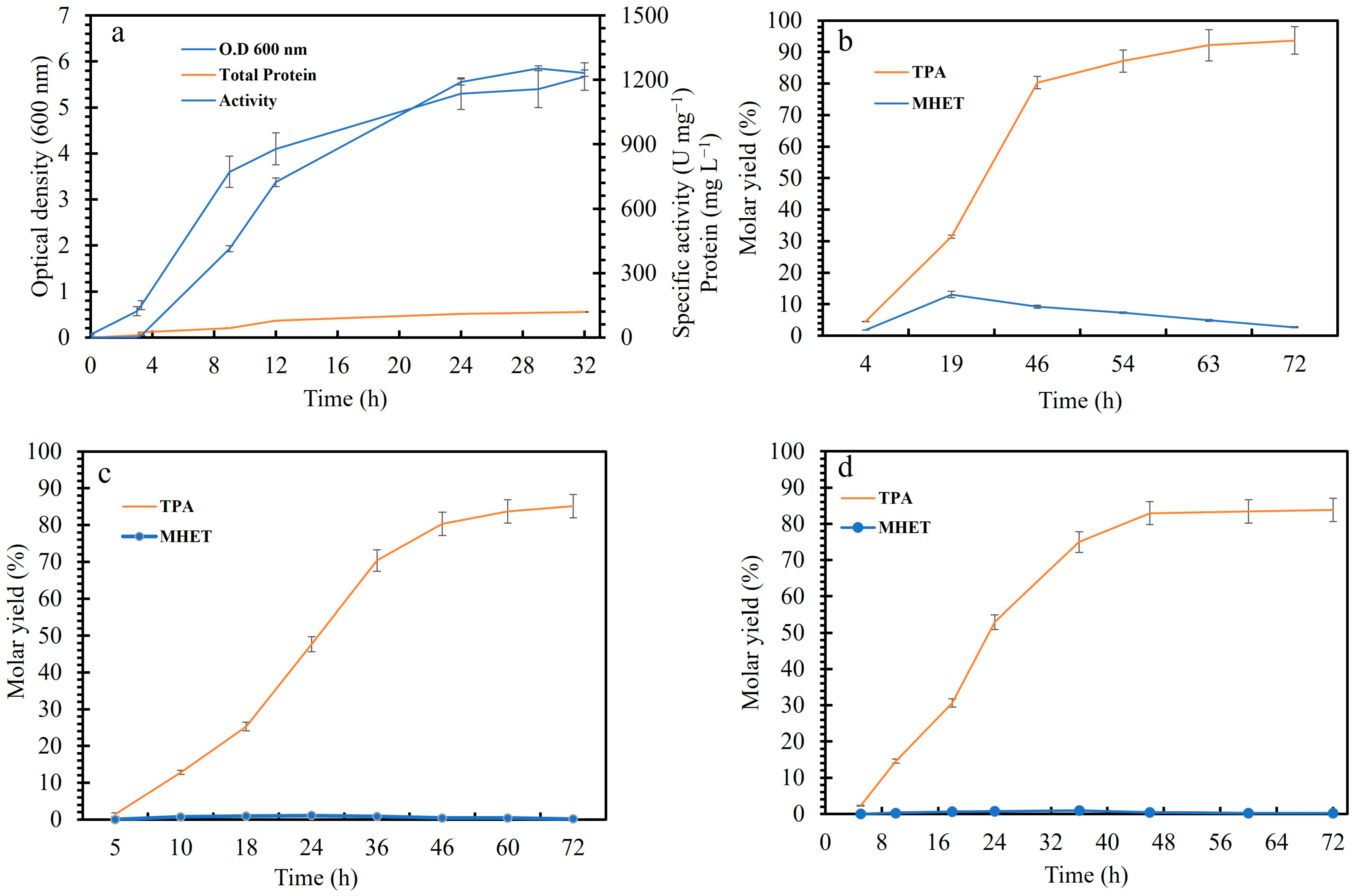 (a) Growth profile, total protein content in the supernatant, and specific activity of LCCICCG-producing E. coli BL21 cells in a 2 L fermenter after induction with IPTG at 2.2 h (O.D600 0.6–0.8). (b) Depolymerization profile (monomer release) of PET film (F250A) using the purified LCCICCG, (c) depolymerization of PET film (F250A), and (d) PET powder (P80A) using crude supernatant of LCCICCG. The reaction was performed in a 1L volume containing 50 mM KH2PO4-NaOH buffer (pH 8.0), 13 g L−1 PET powder, or film, and 1 mg g−1 PET enzyme at 62 °C with pH control (1M NaOH). The monomer release is measured by HPLC.