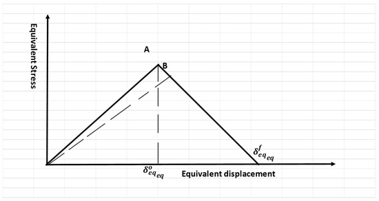 Delamination failure involves crack initiation and crack growth. These two mechanisms are governed by the principles of damage development. When the load reaches a critical value or the maximum peak load, failure occurs. This initiation criterion was established by linear evaluation laws. These evaluation laws reduce the need for refining mesh sizes [28,29,30]. A typical linear tensile separation response is shown in Figure 2. The onset of damage is represented by the initial slope, followed by softening, characterized by the negative linear portion of the curve, which indicates failure beyond the elastic region.