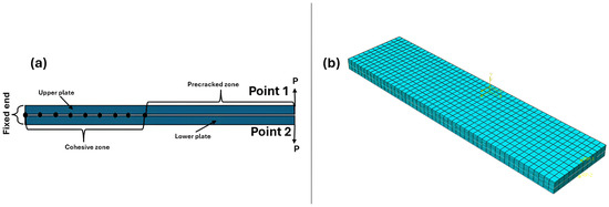 The DCB test was simulated using two plates with 24.4 mm width, 101.6 mm length, 2.14 mm thickness, and pre-crack length 50.8 mm (see Figure 3a). The model was created as a pair of contact with interaction properties for VCCT as mixed-mode (BK) with maximum tangential stress, and the interfacial mixed model values are listed in Table 1. The surface based cohesive zone (SCZM) uses the same interaction behaviors previously discussed, but the cohesive penalty interfacial stiffness is equal to ( N/mm3) [31]. The maximum traction separation N = 80 MPa [31]. This method was used to validate the VCCT as previously explained. The implemented initial clearance was . This method was completely described in Abdellah [11]. The linear evaluation law for both methods were linear shapes, as illustrated in Figure 2. A bilinear, four-node, plane stress quadrilateral element (CPS4R) with reduced integration and deletion capability was employed in the finite element analysis. This element offers a good compatibility between computational efficiency and accuracy, and reduced integration element type in numerical stiffness and hypothetical hourglassing improves performance for large-scale simulations. The deletion feature allows for realistic modelling of material failure, crucial for studying crack initiation and propagation. The mesh, detailed in Figure 3b, utilized 1 mm elements with 2244 elements. The load (P) was applied to point 1, and 2, which coupled with the top and bottom surface of the DCB, as shown In Figure 3a. In previous studies [32,33], the mesh convergence was establish to have little effect in the case of measuring the load carrying capacity of composite plate. Additionally, the linear evaluation damage model in elastic materials reduces sensitivity to mesh density.