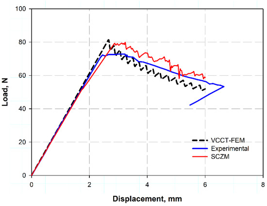 Figure 5 shows the load–displacement relation for DCB measured using VCCT and SCZM compared using the experimental data found in Ref. [34]. It was clear that the prediction was highly close to the experimental data for the two models, while for VCCT it gave a more realistic trend as a zigzag shape corresponding to the loading and unloading action for the ideal test; also, it helps in measuring the compliance of the zigzag slope. Those zigzag and step-like shapes were due to stick–slip crack propagation [37,38,39], some fiber bridging in the direction of the crack, as the crack does not propagate smoothly, but rather arrests temporarily and then jumps forward when the energy release rate exceeds a critical value. Additionally, the fiber bridging the crack resists the load, therefore the load increases, and when this fiber breaks, the load suddenly decreases, making these zigzags. Additionally, due to the heterogeneity in material properties, as the carbon fiber reinforced polymer (CFRP) was an anisotropic material, they exhibit different toughness and strength through the loading direction. Moreover, it returns to frictional interaction during the fixation of the specimen or through the testing machine and other experimental results [39]. However, the predicted curve gave shorter extension than the experimental ones; this was because real CFRP laminates exhibit matrix plasticity, micro-cracking, and local damage at the crack tip. These parameters were important and serious for increasing COD, while for VCCT these factors or parameters were not included for calculations [40]. Moreover, the test machine compliance and slow crack growth in the experiment give longer and increasing COD; however, this factor were not considered in the case of VCCT [39].