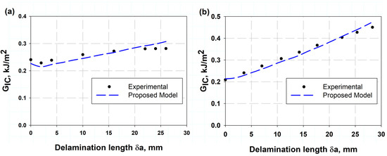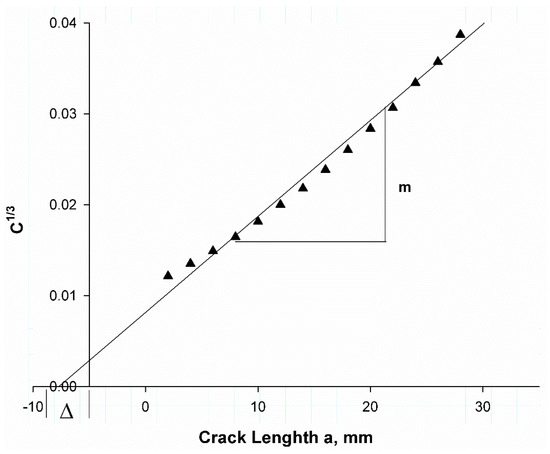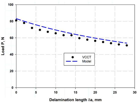 Figure 6 shows predicted compliance using VCCT data. The compliance was calculated at each step of the curve in Figure 5 (black colored line), a crack length correction factor , which can be defined as the intersect of the linear regression with the x-axis, was determined as (7.5 mm), while the experimental value was (6.57 mm) [41]. The difference was because the VCCT ignores a lot of factors in the experimental procedure such as friction between testing machine elements, interaction between layers, and some bridging in some areas during the test.