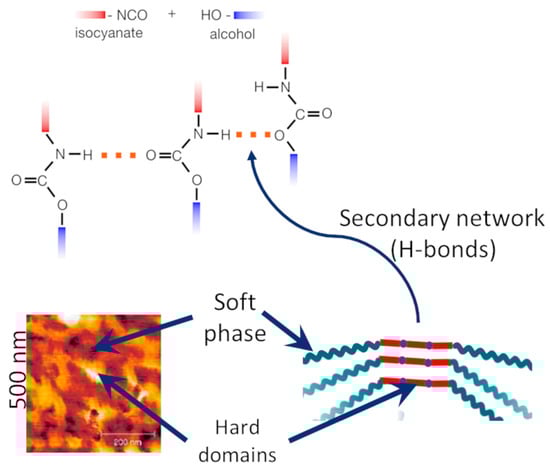 In order to understand how order formation proceeds in polyurethanes, we present some key remarks regarding PU macromolecular structure. In the simplest case (Figure 1), which we will name in the following ‘standard polyurethane elastomers’, the polyurethane is linear, consisting of two types of segments: The first one, called ‘soft segments’, originates from a flexible macrodiol, usually a polyether or polyester. The second, known as ‘hard segments’, is an alternating sequence of fragments originating from a short diisocyanate and a short diol (also known as the chain extender), interconnected with urethane linkages. The hard segments thus produced are obviously rich in urethane groups distributed along the chain in a strictly periodic manner. In addition, urethane groups contain both hydrogen donors (amine) and acceptors (carbonyl group of the carbamide). As intuitively expected, a secondary network of hydrogen bonds is formed (Figure 1), which separates the hard segments from the soft ones. Mesoscopically, this is translated as a phase separation of hard domains consisting almost exclusively of hard segments, distributed in a continuous soft phase consisting mostly of soft segments.