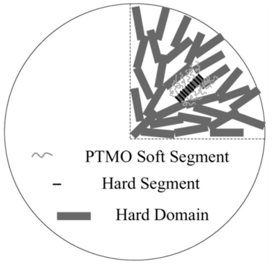 Turning our attention to the soft phase, molecular order forms within this one too, provided that the flexible macrodiol itself is crystalline. An additional condition is that it should be sufficiently long and have a high enough mass ratio so that interchain association is possible; crosslinking hinders crystallization ability, as is the case for homopolymers. A higher degree of phase separation also promotes ordering, as diluted hard segments can act as impurities [21,28,29,30]. The degree of crystallinity of the soft phase has a large impact on Young’s modulus of polyurethanes [17,31].