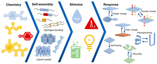 - Lugger, S.J.D.; Houben, S.J.A.; Foelen, Y.; Debije, M.G.; Schenning, A.P.H.J.; Mulder, D.J. Hydrogen-Bonded Supramolecular Liquid Crystal Polymers: Smart Materials with Stimuli-Responsive, Self-Healing, and Recyclable Properties. Chem. Rev. 2022, 122, 4946–4975. [Google Scholar] [CrossRef]