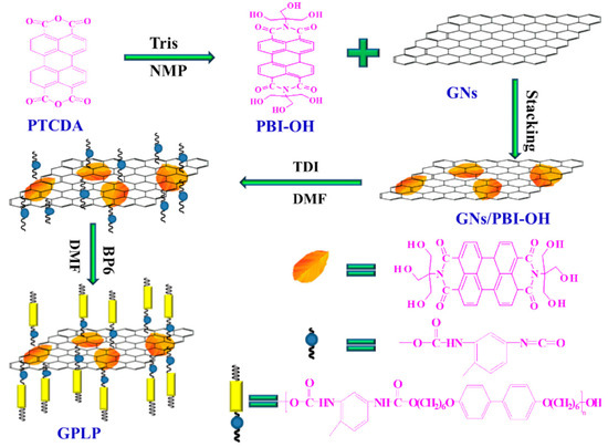 The modification of epoxy resins with liquid crystalline polyurethane-imide was the aim of the study by the Gui group [82]. Significant improvement in the thermal and mechanical properties of the LCPU/epoxy blends was noted. Additionally, a wide range of liquid–crystalline phase transition temperatures was observed, thus increasing the applicability of the systems. The good miscibility and self-assembly of LCPU was found to be an interesting solution to compatibilization issues between epoxy resins and reduced graphene oxide (GO). In the work presented by Zeng et al. [83] authors used a specific structure of perylenetetracarboxylic derivatives to combine graphene oxides with LCPU, then use it as a filler in the epoxy resin matrix. It was found that even a small amount of the LCPU/GO component results in a significant increase in the mechanical and thermal properties of epoxy resins. A similar effect was observed for grafted GO on LCPU [84]. The compatibilization effect of LCPU was also studied for graphene nanosheets and epoxy resins [85]. Here, authors used perylene derivatives in order to form π-π stacking interactions with LCPU, and the obtained hybrids were used as filler for epoxy resins—Figure 4. As in the composites mentioned above, the hybrid-supported systems exhibited higher tensile strength, Young’s modulus, toughness, and enhanced thermal stability.