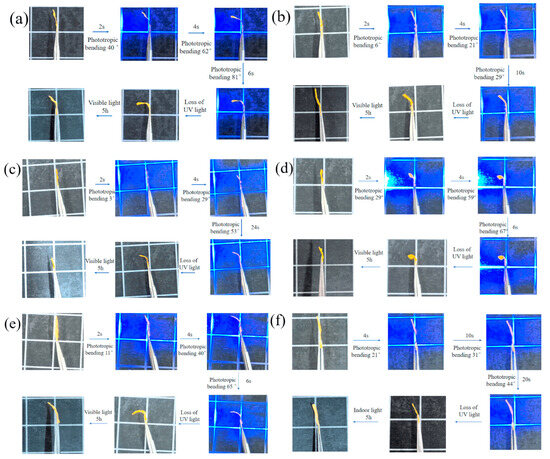 Photoresponsive properties of fibrous LCPU based membranes. (a) LCPU-1:SMPU = 1:2, (b) LCPU-1: SMPU = 3:4, (c) LCPU-1:SMPU = 1:1, (d) LCPU-2: SMPU = 1:2, (e) LCPU-3: SMPU = 1:2, (f) LCPU-3: SMPU = 3:4. Reprinted from [113] with permission from MDPI.