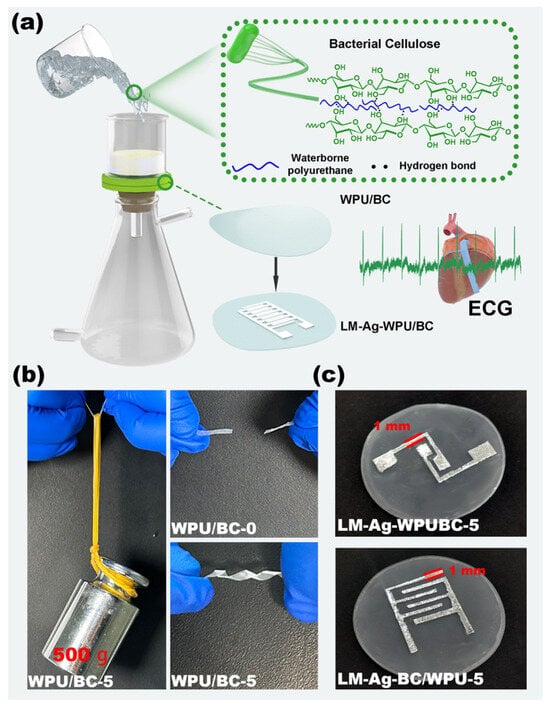 The preparation process for the WPU/BC composite film is illustrated in Figure 1a. First, the BC suspension was thoroughly mixed. The solvent was then removed via vacuum filtration, and the mixture was dried at room temperature, resulting in a soft film with a dense structure. Photographs of the WPU/BC films (WPU/BC-0 to WPU/BC-5) fabricated using this method are shown in Figure S1. The modified composite film exhibited sufficient flexibility to serve as a substrate for flexible electrodes, enabling real-time ECG monitoring. As depicted in Figure 1b, the synthesized WPU/BC-5 film (length: 35 mm; width: 2 mm; thickness: 50 μm) could easily support a 500 g weight, whereas the WPU/BC-0 film of the same dimensions failed under a 100 g load. Furthermore, the WPU/BC-5 film demonstrated remarkable flexibility, toughness, and resilience, tolerating complex distortions and exhibiting elastomer-like properties. After the magnetron sputtering an Ag layer onto the WPU/BC-5 film, EGaIn was firmly deposited to create LM-Ag-WPU/BC-5 electrodes, as shown in Figure 1c.