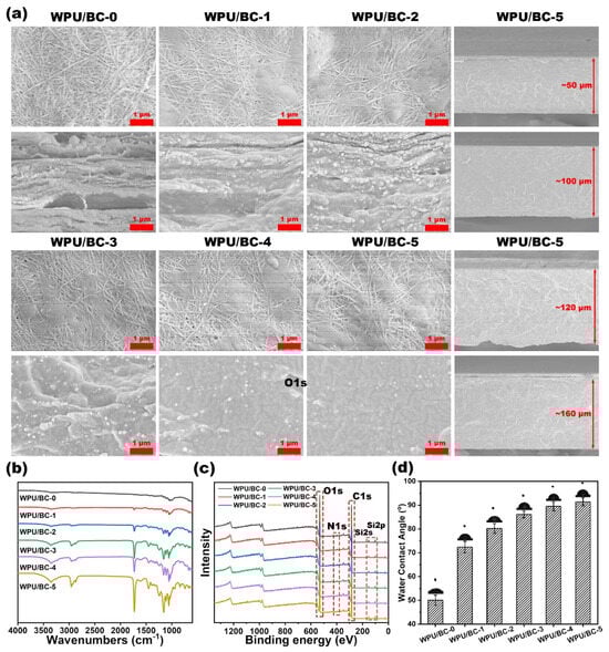 (a) SEM images of WPU/BC-0 to WPU/BC-5 films showing surface (top) and cross-section (bottom) morphologies, along with cross-sectional images of WPU/BC-5 films with varying thicknesses. (b) FTIR spectra of WPU/BC-0 to WPU/BC-5 films. (c) XPS analysis of the surfaces of WPU/BC-0 to WPU/BC-5 films. (d) Water contact angle measurements for the surfaces of WPU/BC-0 to WPU/BC-5 films.