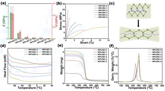 (a) Equivalent elastic modulus (E) and surface hardness (H) of WPU/BC-0 to WPU/BC-5 films. (b) Stress–strain curves of BC/WUP films before and after stretching. (c) Schematic illustration of the stretchable network of BC/WUP composite. (d–f) DSC, TGA, and DTG curves of the pristine BC and WPU/BC composite films.