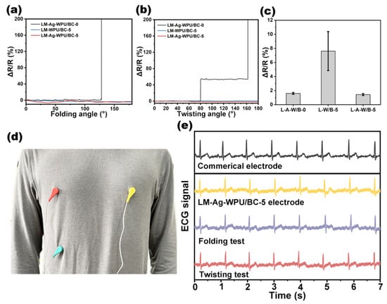 The electrical stability of the flexible electrodes during deformation was evaluated. Resistance changes in LM-Ag-WPU/BC-0, LM-WPU/BC-5, and LM-Ag-WPU/BC-5 during folding and twisting are shown in Figure 4a,b. For the rigid BC substrate (WPU/BC-0), poor flexibility resulted in substantial resistance changes during deformation. In contrast, the WPU/BC-5 substrate demonstrated excellent flexibility, maintaining stable resistance under similar conditions.