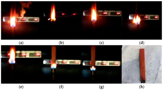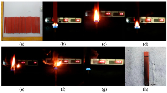 Changes in the vertical burning phenomenon after PVC aging for 4 days: (a) before combustion, (b) 5 s, (c) 10 s, (d) 15 s, (e) 20 s, (f) 25 s, (g) 28 s, (h) after burning.