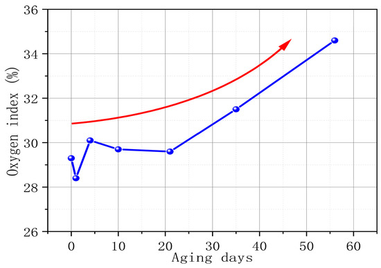 The oxygen index refers to the minimum oxygen concentration required for a material to burn with a flame in an oxygen–nitrogen mixed gas flow under specified conditions. It is expressed as the volume percentage of oxygen. A high oxygen index means that the material is not easy to burn, and a low oxygen index means that the material is easy to burn. Figure 4 tests the change in PVC oxygen index with aging time. As the aging time increases, the oxygen index of PVC shows an obvious growth trend. From S0 to S6, the oxygen index of PVC increases by 18.09%. This phenomenon further supports our view point that the higher the degree of PVC aging, the less likely it is to burn. In addition, it is worth noting that the oxygen index of PVC in the first three stages of the aging process fluctuates. This phenomenon is mainly due to the precipitation of internal additives (such as antioxidants, plasticizers, and additives) and the diffusion of gas products in the early stage of PVC aging.