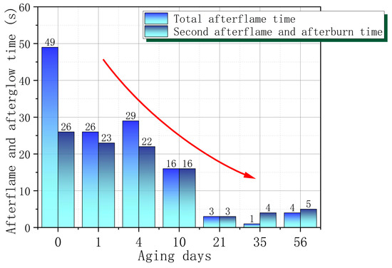 Figure 5 shows the afterflame and afterglow time during the vertical combustion test of PVC with different aging times. It can be observed that the overall second afterflame and afterglow times of PVC decrease with increasing aging time, especially after 21 days, the second afterflame and afterglow times decrease significantly. In addition, from the S0 to S7 stage, the combustion flame gradually becomes weaker and the self-extinguishing speed is faster. The oxygen index change data further confirm that the flame-retardant performance of PVC improves as the aging time increases, and after 21 days, the flame retardant performance is significantly improved. This means that the ignition risk of PVC samples after wet heat aging is relatively low. In other words, once the newly used PVC material is ignited, the danger of its burning spreading and helping the fire to cause a disaster is greater. Therefore, for the newly used PVC material, special attention must be paid to prevent ignition from external fire sources or strong heat sources.