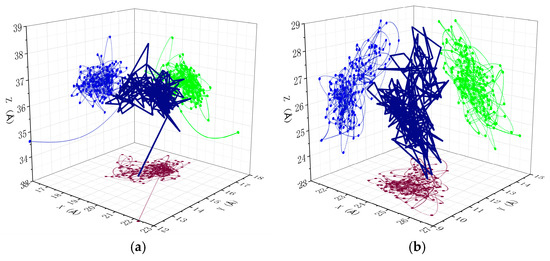 Figure 10 displays the diffusion trajectories of combustibles in unaged and aged PVC samples, providing further confirmation of the aforementioned conclusions. The figure shows the diffusion trajectory of combustibles in PVC samples and their projected trajectories on the X, Y, and Z axes. For consistency in comparison, the scales of the XYZ axes were standardized for both unaged and aged PVC samples. The simulation results indicate that combustibles in unaged PVC exhibit a more compact diffusion pattern, with a relatively smaller diffusion range across all three spatial directions (X, Y, and Z). In contrast, as the aging degree of the PVC samples increases, the diffusion range of combustibles expands and becomes more dispersed, particularly in the Y and Z directions. This observation reinforces the idea that aging enhances the mobility and diffusion of combustibles, contributing to the improved flame retardant performance of PVC over time.