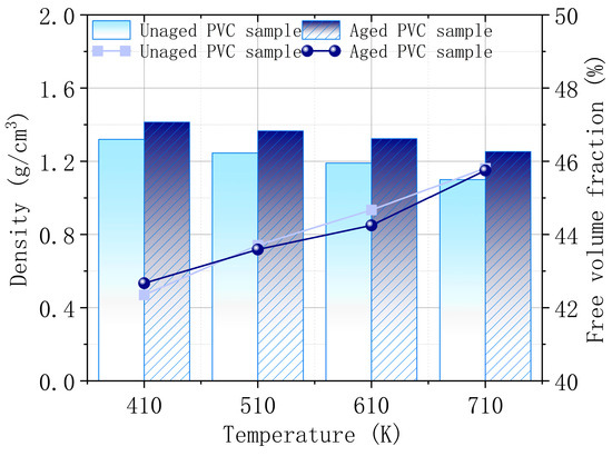 The calculation results in Figure 11 indicate that the density of the PVC surface increases, and the free volume fraction decreases as CaCO3 precipitates during aging. This increased surface density enhances the thermal stability of the material, while the reduced free volume fraction suggests fewer voids between molecules, limiting molecular mobility. The greater density and reduced free volume mean that the PVC surface becomes more compact, resulting in stronger intermolecular forces and better thermal stability. At four typical combustion temperatures, the aged PVC samples consistently exhibit improved thermal stability compared to the unaged ones. However, as the temperature rises, both the density and free volume fraction of PVC samples show a decreasing and increasing trend, respectively. This indicates that the higher the temperature, the more molecular expansion occurs, weakening the material’s thermal stability and making it more prone to combustion. These findings align with the observed behavior of PVC during the combustion tests, where higher temperatures make PVC more flammable, particularly in the unaged samples.