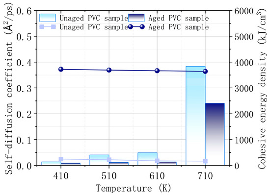 Figure 12 illustrates the changes in the self-diffusion coefficient and cohesive energy density of the PVC surface before and after aging at different temperatures. The results indicate that the self-diffusion coefficient of the PVC surface is higher before aging compared to after aging, across all temperature ranges. This suggests that molecular mobility is greater in unaged PVC, which may facilitate the diffusion of combustibles and promote combustion. As the temperature rises, the self-diffusion coefficient increases significantly, indicating a marked decline in thermal stability at higher temperatures, regardless of the aging status. The cohesive energy density, which reflects the strength of intermolecular forces, shows a clear increase in aged PVC samples. This is attributed to the precipitation of CaCO3 on the surface, which enhances the intermolecular forces, thereby improving the thermal stability of the PVC material. Stronger intermolecular forces reduce the likelihood of combustion reactions, making aged PVC more resistant to burning. Thus, the simulation confirms that the CaCO3 precipitate not only restricts the movement of molecules but also plays a crucial role in enhancing the flame-retardant properties of PVC after wet heat aging.