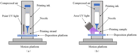 Three-dimensional printing and UV curing process with different methods: (a) UFC and (b) DIW.