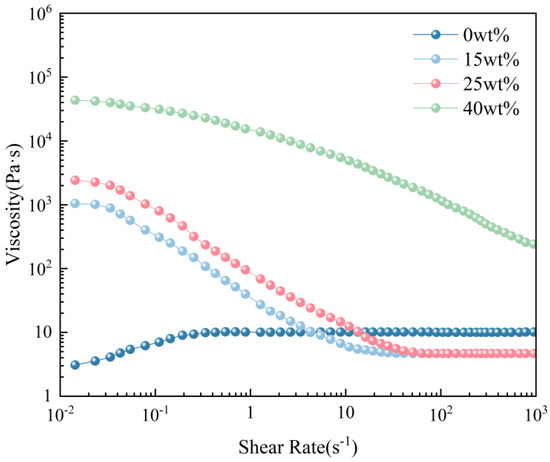 To investigate the impact of UFC on the printability and dimensional accuracy of low-yield-stress inks, printing ink with low yield stress was prepared by adjusting the mass fraction of polytetrafluoroethylene (PTFE). The rheological properties of silicone printing ink with different PTFE contents were experimentally obtained. Figure 3 illustrates the results from steady-state flow scans, while Figure 4 presents the results from oscillatory stress scans.