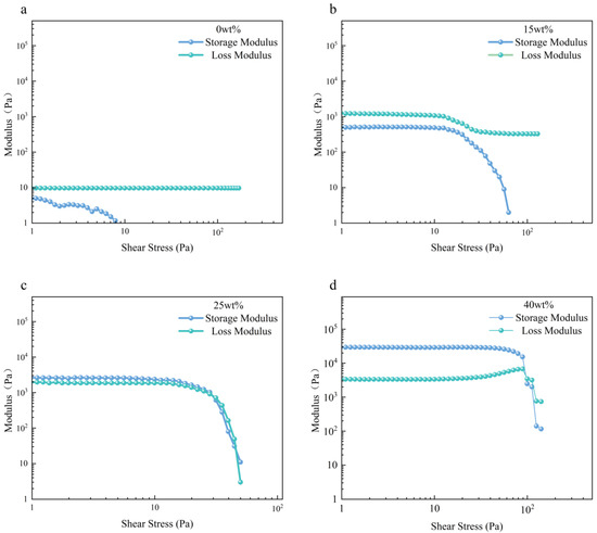 Oscillatory stress–sweep results for (a) ink with 0 wt% PTFE, (b) ink with 15 wt% PTFE, (c) ink with 25 wt% PTFE, and (d) ink with 40 wt% PTFE.