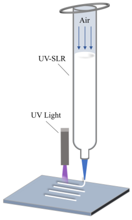 Another approach is to make the printing ink undergo a curing reaction after deposition through the stimulation of an external device. Most of these methods involve modifying the DIW printer according to the special chemical components added to the ink, such as adding an ultraviolet light source [30] or using a two-component mixing extruder [31], a temperature-controlled extruder [32], or a temperature-controlled deposition plate [33]. In summary, thermal curing requires a high-temperature environment, which may limit the application of thermally sensitive materials. Due to the slow reaction speed, chemical curing is difficult to use to meet the needs of real-time molding. In contrast, photocuring is cured by instant cross-linking and is especially suitable for the high-precision printing of low-viscosity materials.